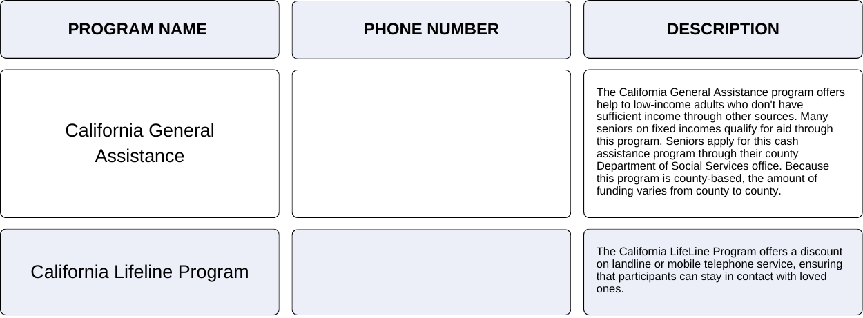 Cash assistance programs in California provide financial support to help low-income retirees remain in their own homes for as long as possible. Seniors and caregivers can apply for tax rebates and reductions, discounts on vital services and help covering the cost of heating and cooling their home. (California General Assistance, California Lifeline Program)