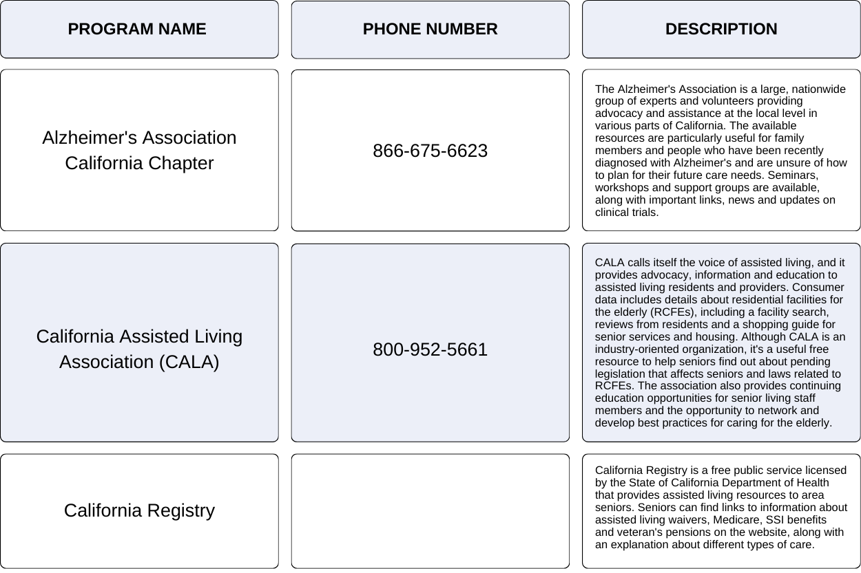 Senior centers in California bring together residents through recreational activities and events. Many also offer advice and support on senior issues, run wellness and nutrition programs, and connect older adults with other resources in the local area. (Alzheimer's Association California Chapter, California Assisted Living Association (CALA))